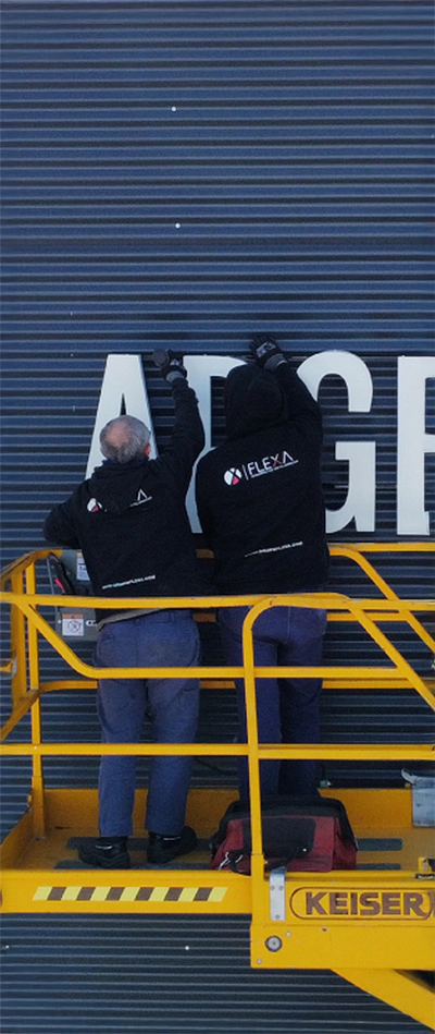 Diseñados en estructuras metálicas resistentes, perfectos para fachadas de gran tamaño. Se iluminan de forma frontal mediante reflectores LED. Pueden realizarse en chapa pintada, en lona impresa o tensada, según el diseño y proyecto.